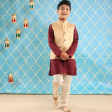 Beige Brocade Bandi With Maroon Kurta & Pyjama Set For Son