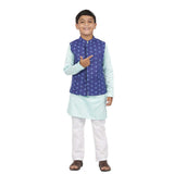 Blue geometric print bandi with pastel green kurta & pyjama for father-son