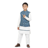 Digital print satin bandi with sea blue cotton kurta & white pyjama for father-son