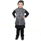 Floral Print Grey Bandi With Printed Kurta And Pyjama Set For Son