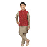 Maroon geometric print bandi with olive green kurta & pyjama for father-son