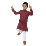Maroon printed kurta with white pyjama set for father-son