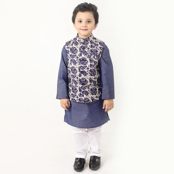 Navy Batik Rose Print Bandi With Kurta And Pyjama Set For Son