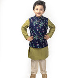 Navy Corduroy Floral Bandi With Matching Kurta And Pyjama Set For Son