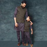 Featuring an Olive green bandgala bandi in cotton with embroidered collar and pocket bone. It comes along with Grey kurta and pyjama. It has Golden button closure detailing on the front placket by BonOrganik are both comfortable and stylish from our collection for father & son.