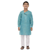 Sea blue stylised placket cotton kurta with white pyjama set for father-son