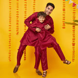 Exuding classic charm and expressing elegant style, this Red combination of kurta and pajama from Bonorganik steals the limelight with its beautiful look. Get This matching Indo-western outfit for the duo Father-Son.